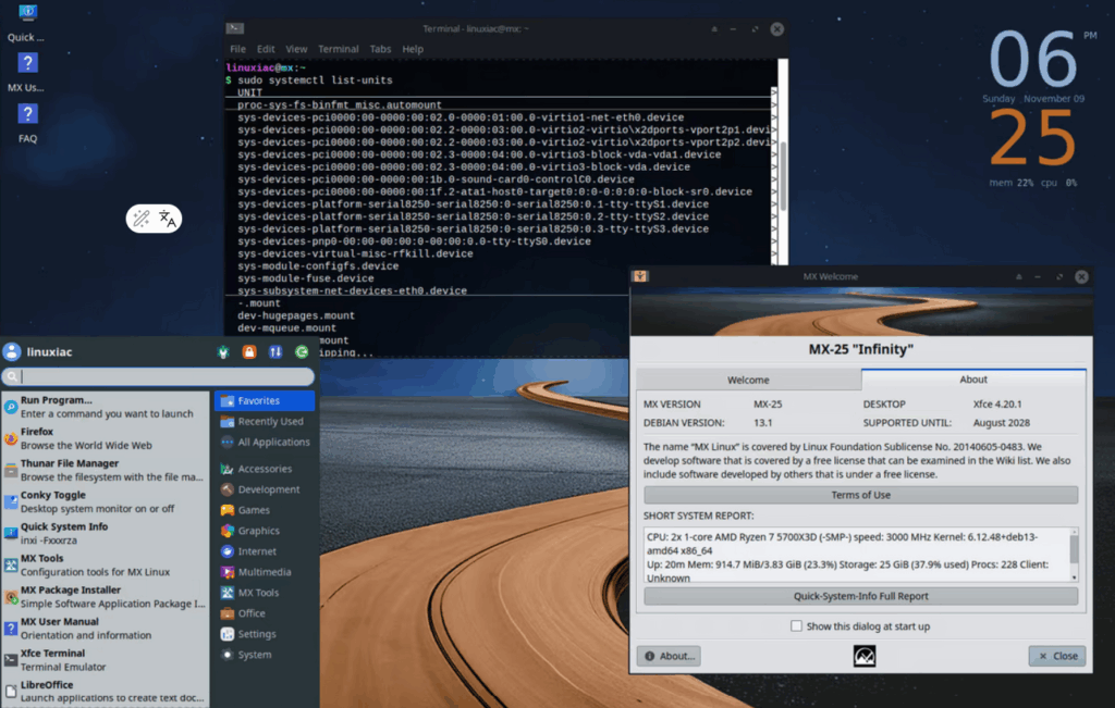 MX Linux 25 полностью отказался от 32-разрядных сборок, сосредоточившись на современных 64-битных системах (x86_64). - Обновлённое ядро Linux 6.12.48 и версия AHS